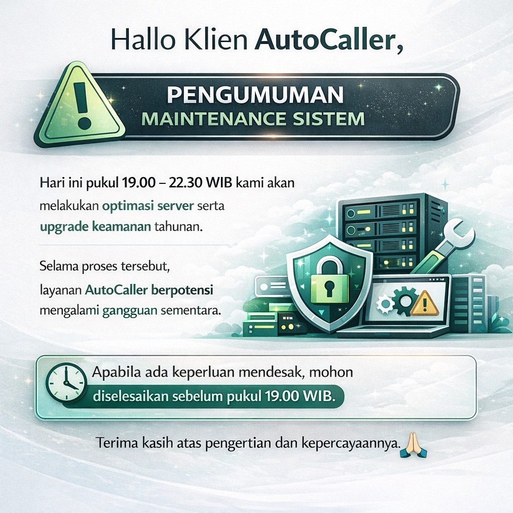 Hari ini kami informasikan bahwa Autocaller akan rilis major update pertama v1.1.0 pada 05/12/2025 pukul 22:00 WIB.