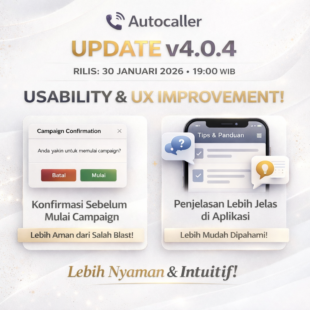 Dengan update ini, kami berharap pengalaman menggunakan Autocaller menjadi lebih intuitif, aman, dan nyaman, terutama saat menjalankan campaign penting.